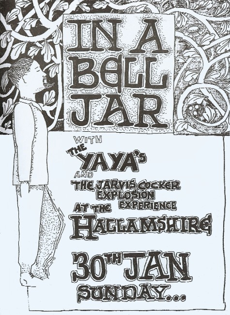 In A Belljar was formed by Michael Paramore and Tim Allcard in Autumn 1982, and had a rotating cast of other members that would play at some or all of their gigs. The group first performed at the Hallamshire on October 31 that year, and were joined soon afterwards by Jarvis, who hit tin cans at most of their concerts until the band split in mid-1983. According to Michael Paramore, In A Belljar played over 40 gigs, mostly as support act at the Hallamshire, but only the following are known about: