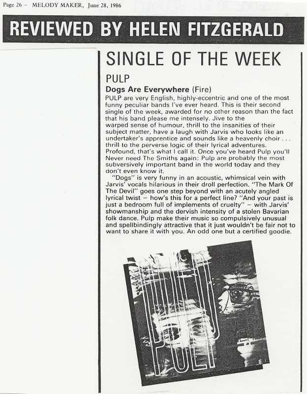 Not so much left of centre as almost off the wall, Sheffield's Pulp play pop, on 'Dogs Are Everywhere' (Fire), which resounds with the ambiguity and wit that's so glaringly absent from Suzanne Vega type songs. While never being the pertect pop artetact, this five track EP exudes a sense of mystery which is made all the more enticing by Pulp's tendency to mix moments of stark musical morbidity with staggeringly ridiculous lyrics.
