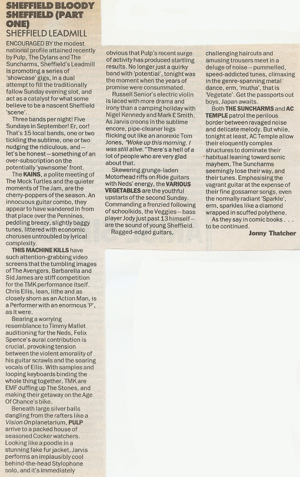 Encouraged by the modest national profile attained recently by Pulp, The Dylans and The Suncharms, Sheffield's Leadmill is promoting a series of 'showcase' gigs, in a dual attempt to fill the traditionally fallow Sunday evening slot, and act as a catalyst for what some believe to be a nascent Sheffield 'scene'.