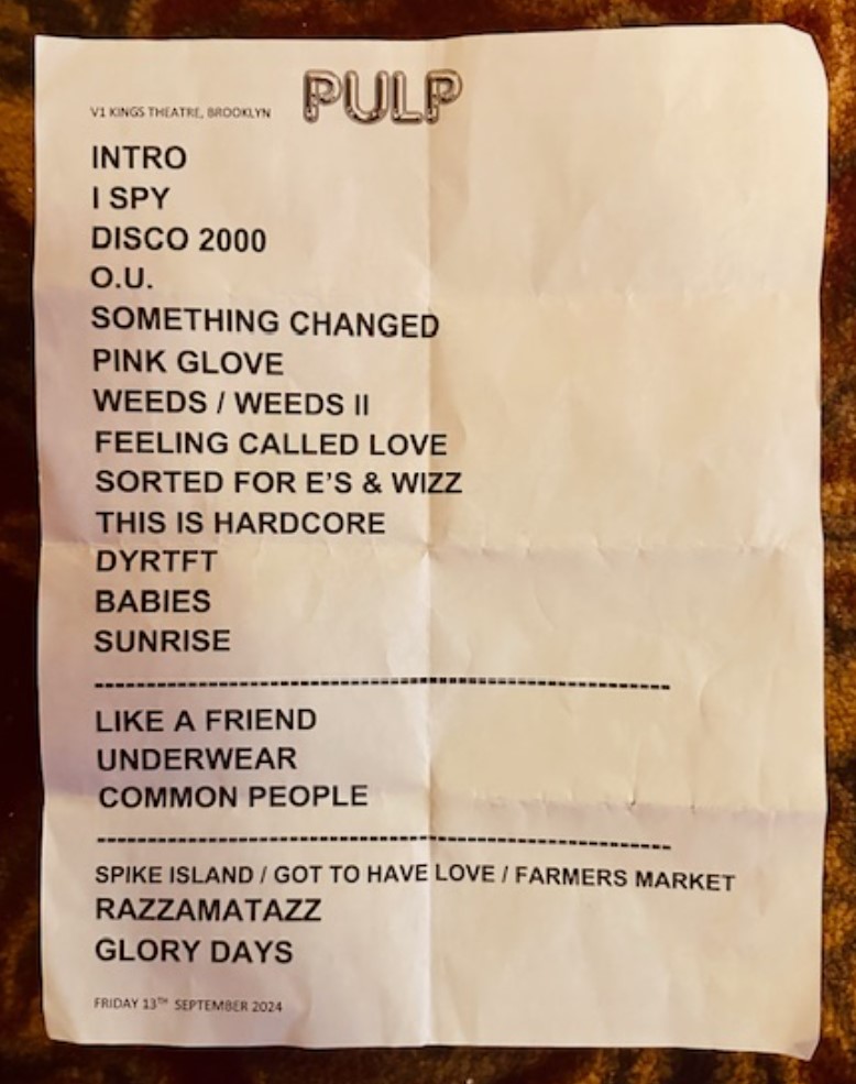 The 555th concert played by Pulp. Got to Have Love, originally written and recorded as a demo during sessions for the We Love Life album in 1999 and 2000, was performed live for the very first time. New songs Spike Island and Farmers Market also appeared on the setlist but were not played.