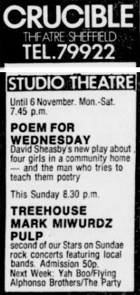 Me and my girlfriend had met a lad called Dave Kurley who, that October, put on a small run of concerts by local bands at the famous Crucible Theatre. Truth be told it was in the much smaller studio next to the main auditorium.