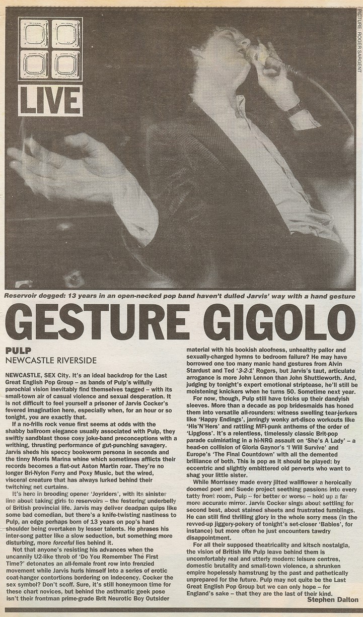 Not that anyone's resisting his advances when the uncannily U2-like throb of 'Do You Remember The First Time?' detonates an all-female front row into frenzied movement while Jarvis hurls himself into a series of erotic coat-hanger contortions bordering on indecency. Cocker the sex symbol? Don't scoff. Sure, it's still honeymoon time for these chart novices, but behind the asthmatic geek pose isn't their frontman prime-grade Brit Neurotic Boy Outsider material with his bookish aloofness, unhealthy pallor and sexually-charged hymns to bedroom failure? He may have borrowed one too many manic hand gestures from Alvin Stardust and Ted '3-2-1' Rogers, but Jarvis's taut, articulate arrogance is more John Lennon than John Shuttleworth. And, judging by tonight's expert emotional striptease, he'll still be moistening knickers when he turns 50. Sometime next year.