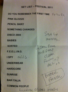 The first concert of Pulp's 2011 reunion tour. It was intentionally a low-key affair, a warm-up for their festival appearances in the following weeks. There was almost no publicity, with even the listing on the venue's website disappearing after a few days.