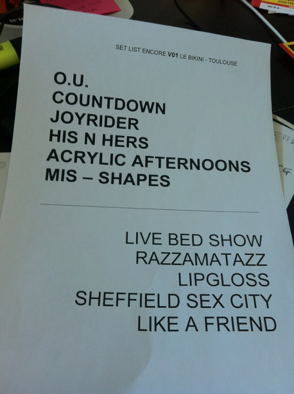 The setlist was dominated by material from His 'n' Hers and Different Class. Only one song each from This Is Hardcore and We Love Life was played.