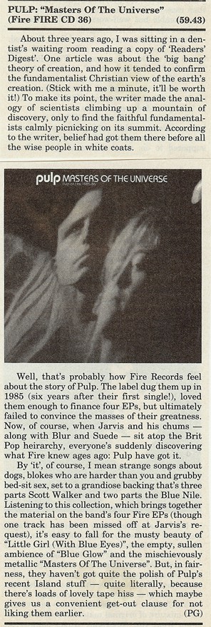 One can almost smell the fetid stench of "cash in" as "Masters Of The Universe" arrives on the racks. But not wanting to get all libellous and bitter that Pulp have had to wait 14 years before kissing the hem of that fickle mistress, Pop Stardom, one must thank the bods at Fire for supplying us with this compilation of Pulp's never-made-its.