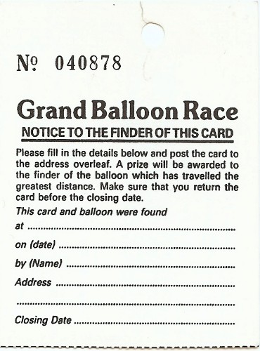 1000 balloons will be launched from Devonshire Green. Sheffield at precisely 3:30 p.m. on Monday the 11th of May. Each balloon has a tag attached to it, similar to the one enclosed with this communication. Keep your tag as it allows free access to the party being held after the Leadmill concert. (N.B. - it does not allow free access to the concert itself.)