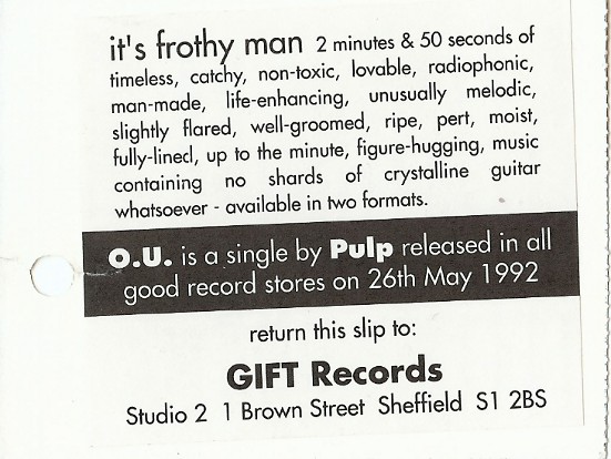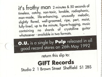 The strange, upside down universe of Jarvis Cocker Comes round on its orbit again, this time partly eclipsed by wrangles between them and their former label Fire. 'O.U.' their first release on new Sheffield label Gift, takes three plays to get hold of, but jogs along like a devil with Cocker doing his Travolta/Stardust bit in the middle. The glam-shackle Pulp make you think of spaceships and tower blocks and trains. Marvellous.