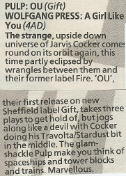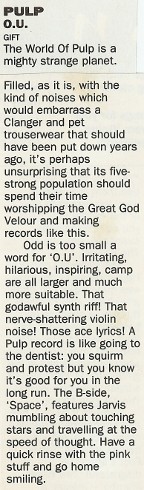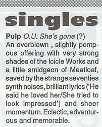 "O.U." (Oh you? Open University?) is three minutes of staggering popgasm. Sharing a similar disdain for the age as Suede (which, of course, makes it feverishly modern) its prime difference is that it is out of control. Jarvis Cocker's love-life brims, it seems, with the elation that comes with phenomenal doubt, pain and failure. "Cherish and be damned" is Pulp's implicit motto, while Suede are more the, "Damn and be cherished" types.