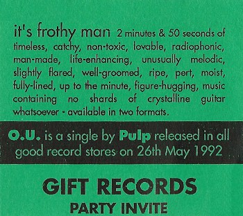 it's frothy man, 2 minutes & 50 seconds of timeless, unconditionally guaranteed, perfectly formed, catchy, non-toxic, lovable, sexually enlightened, 150 B.P.M., radiophonic, stylophonic, stereophonic, man-made, organic, life-enhancing, fast'n'loud, brand new, frantic, overwrought, unusually melodic, slightly flared, well-groomed, irresistible, ripe, pert, tight as, arousing, seductive, moist, fully-lined, up to the minute, fashionable; durable, well-designed, figure-hugging, gripping music containing no shards of crystalline guitar whatsoever - available in three formats; super duper.
