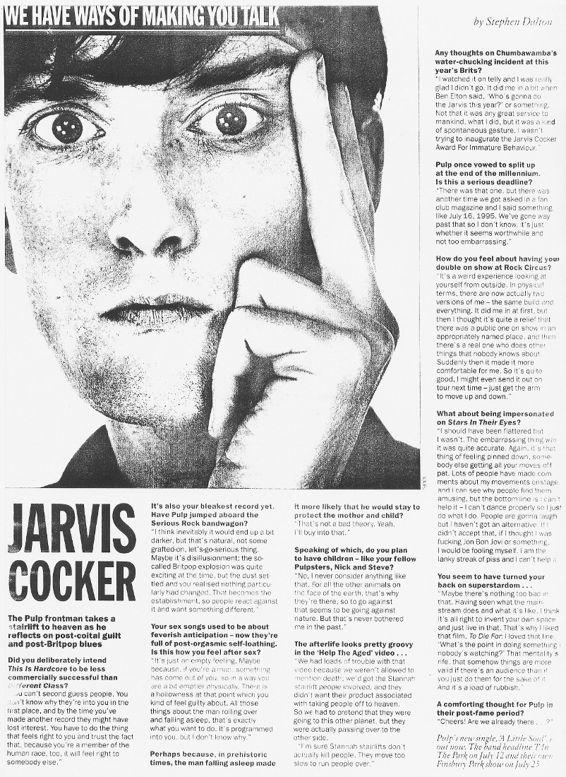 In this country a lot of people tended to resent us for not making another record that sounded like Different Class, as if we were being bait…..churlish," Cocker says, eye lids fluttering behind mauve-tinted '70s specs. "But that formulaic approach doesn't appeal to me at all. I couldn't live with myself. The trouble is, if you become aware of the fact that people know who you are, that can sometimes make you bait self-conscious and you worry about people's expectations. You have to get beyond that and back on an instinctive level. Otherwise you produce rubbish."