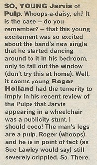 Jarvis: "we'd rather not even be thought of as another band, let alone another Sheffield band. We play music so obviously we're seen as a band, but music is just our chosen form of communication really. Nice tunes are all very well but a song should get something across as well. As for Sheffield, it's big and smelly. There's no scene - just lots of people trying to outshoot each other." Russell reciprocates this view: "In Sheffield the 'local' stigma is a pretty difficult one, i.e. there's an image of what Sheffield music sounds like (A cross between New York funk and a steel factory) and we don't sound like it. What pisses me off is that the tag doesn't fit Sheffield at all. We're proud to be part of the varied and very healthy scene that is Sheffield music. For the record I feel that Pulp stem very much from Sheffield's industrial culture, but that doesn't mean we can only appeal to Sheffield people or that we sound horrible. Something to do with having to make your own beauty because the sights and smells around you all offend the senses.. Now the 'scene' is entirely different and there are a lot more bands like us (i.e. with songs rather than noises or textures) doing interesting things."