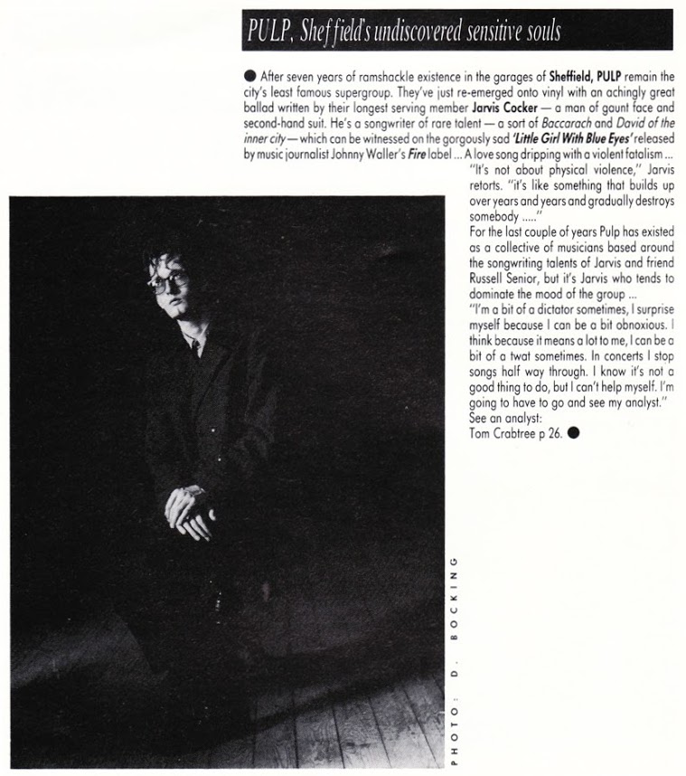 Sheffield purveyors of last Xmas's finest moment, PULP's 'Little Girl With Blue Eyes' (There's a hole in your heart, and one between your legs/You've never had to wonder which one he's going to fill), was a Scott Walkerish sinister paean to pre-Flasher halcyon days. Also on that EP was the awesome "Will to Power', deconstructed Leni Riefenstahl comes to dole gloom Britain, replete with tin trumpet orchestration and vocal histrionics. The impending nationwide visceral and cerebral putsch wasn't to happen though, as frontman Jarvis Cocker saw in the New Year by walking out of a second storey window into a wheelchair. Back in dingy studios, work began on a collection of Jacques Brel sings Roman Polanski chansons, about to be unleashed in the form of an LP 'Freaks', and the single 'They Suffocate By Night' (both Fire). Their outing at the 100 Club on Thursday is going to be their first for some time, and they have no intention of 'going on the road', so if you only go to one gig a year, make it this. To be filed somewhere between Ian McEwan and Charles Hawtrey. (Andy Darling)