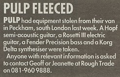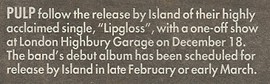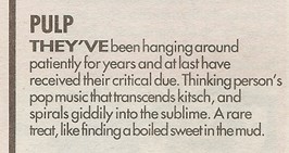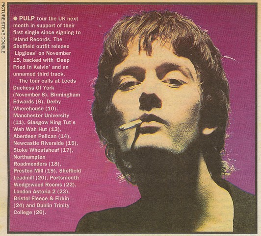Pulp's first major-label single, "Lip Gloss", marks a determination "not to sing songs about pikelets". The B-side is the extraordinary "Deep Fried in Kelvin", a major piece of social observation which, its author observes succinctly, "sounds like 'Another Day in Paradise' by Phil Collins, but isn't". Kelvin is a sombre estate in Sheffield, a place "where pigeons go to die". "Suffer the little children to come unto me," intones Jarvis the tower-block messiah, "and I will tend their adventure playground splinters and cigarette burns, and feed them fizzy orange and chips; that they may grow up straight and tall."
