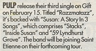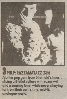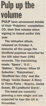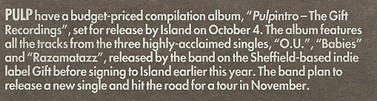 The three EPs which made the band's name came out between June of last year and February of this, and are now being reissued by their new record company as Pulpintro, The Gift Recordings (Island, low price CD/LP/tape, out now). As well as "Sheffield: Sex City", there's the splendidly catchy "Babies", which is essentially an episode of Grange Hill scripted by David Lynch, and the vibrant "Razzmatazz". Best of all though is "Inside Susan: A Story in 3 Parts" – a psychological odyssey of greater depth and complexity than any previously attempted in British pop music. Susan the adolescent temptress lights up a land of "sky-blue trainer bras" and "German exchange students who were very immature", before settling for a man whom Jarvis – "Oh, he's an architect and such a lovely guy" – plainly wants dead.