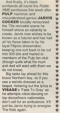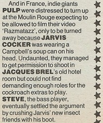 This man is such a born star, you'd think his band must come from no-where, but before they stepped into something like the limelight a year or so ago, Pulp had toiled away in obscurity for more than a decade. They were not easy times. Irate rugby players threw bottles at them. For a year or so Jarvis appeared on stage in a wheelchair, having fallen badly when jumping out of a window to impress a girlfriend. But they had only themselves to blame for this ill-fortune.