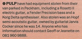 "We used to be quite confrontational." Jarvis says. "We had this bloke who used to read poetry between songs and he'd got one of those sirens that factories use to tell people it's time to go home, and he used to set it off at random moments. It was very loud and at one concert he blew all the fuses in the building, so it was 20 minutes before we could start the next song." What was the atmosphere like during that time? "It wasn't good."