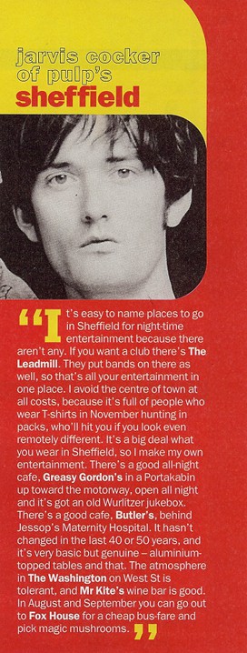 Jarvis Cocker sings about sex, Sheffield, lip gloss and chips. Ben Thompson met him"Intake, Manor Park, The Wicker, Norton, Frecheville…" A deadpan South Yorkshire voice reading off a list of local place names is not a conventional start to a great pop record, but that's how Pulp's "Sheffield: Sex City" beings. The song is a 10-minute epic of comic urban lust. The rapidly overheating narrator scours the streets in search of his lover – "I just wanna make contact with you... that's all I wanna do" – while all around him the city seethes with unsuppressed eroticism. "There were dogs doing it in central reservations," he shudders, with priapic longing. "We heard groans coming from a T-reg Chevette."