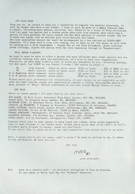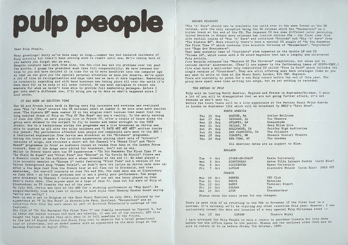 Pulp People fanclub newsletter ten was written by Mark Webber in September 1994.