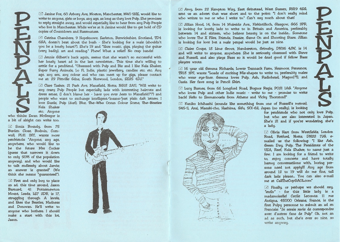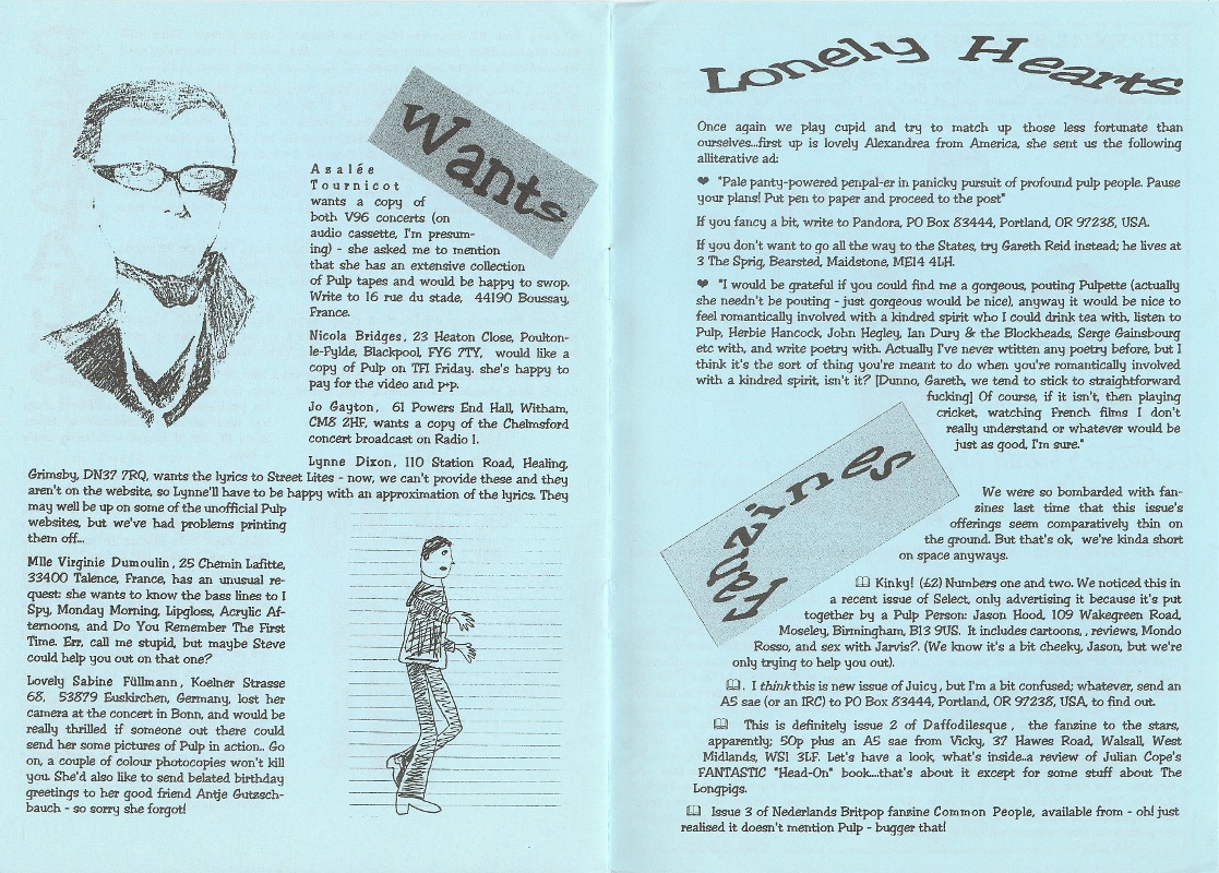 ♥ "I would be grateful if you could find me a gorgeous, pouting Pulpette (actually she needn't be pouting - just gorgeous would be nice), anyway it would be nice to feel romantically involved with a kindred spirit who I could drink tea with, listen to Pulp, Herbie Hancock, John Hegley, Ian Dury & the Blockheads, Serge Gainsbourg etc with, and write poetry with. Actually I've never written any poetry before, but I think it's the sort of thing you're meant to do when you're romantically involved with a kindred spirit isn't it? [Dunno, Gareth, we tend to stick to straightforward fucking] Of course, if it isn't, then playing cricket, watching French films I don't really understand or whatever would be just as good I'm sure."