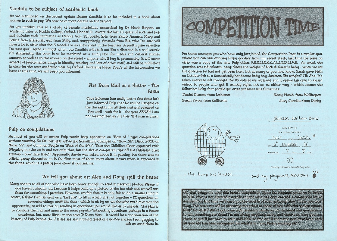 For those amongst you who have only just joined, the Competition Page is a regular spot where you can win exciting Pulpy goodies from my secret stash; last time the prize on offer was a copy of the new Pulp video, F.E.E.L.I.N.G.C.A.L.L.E.D.L.I.V.E. As usual, the question was ridiculously easy: guess the weight of Nick & Sarah's baby - when we set the question he had not yet been born, but as many of you now know, Sarah gave birth on October 4th to a fantastically handsome baby boy, Jackson. His weight? 7lb 8oz. It's taken weeks to sift through the 29 entries we received, and it seems fair only to award videos to people who got it exactly right, not an oz either way - which means the following lucky four people get extra presents this Christmas: