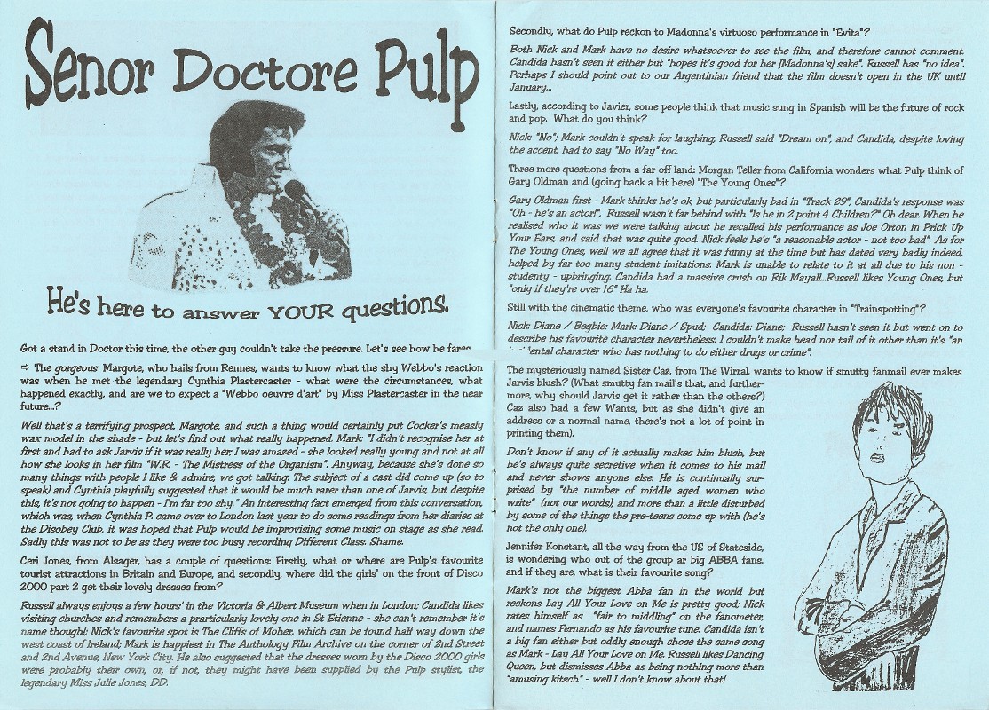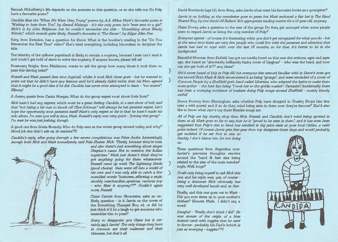The mysteriously named Sister Caz, from The Wirral, wants to know if smutty fanmail ever makes Jarvis blush? (What smutty fan mail's that, and furthermore, why should Jarvis get it rather than the others?) Caz also had a few Wants, but as she didn't give an address or a normal name, there's not a lot of point in printing them).