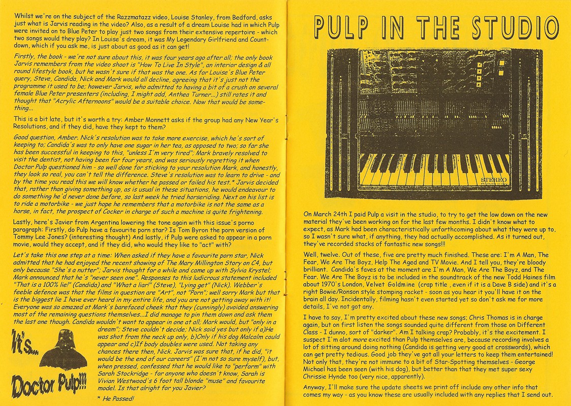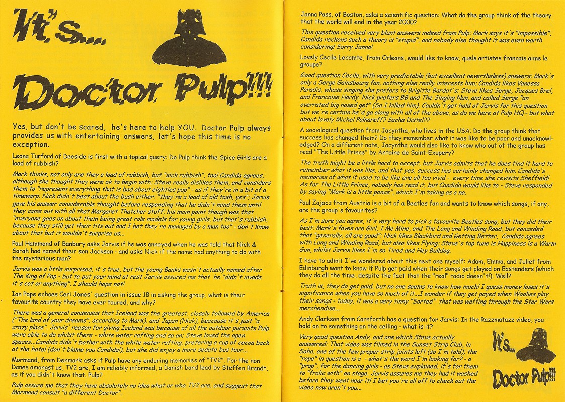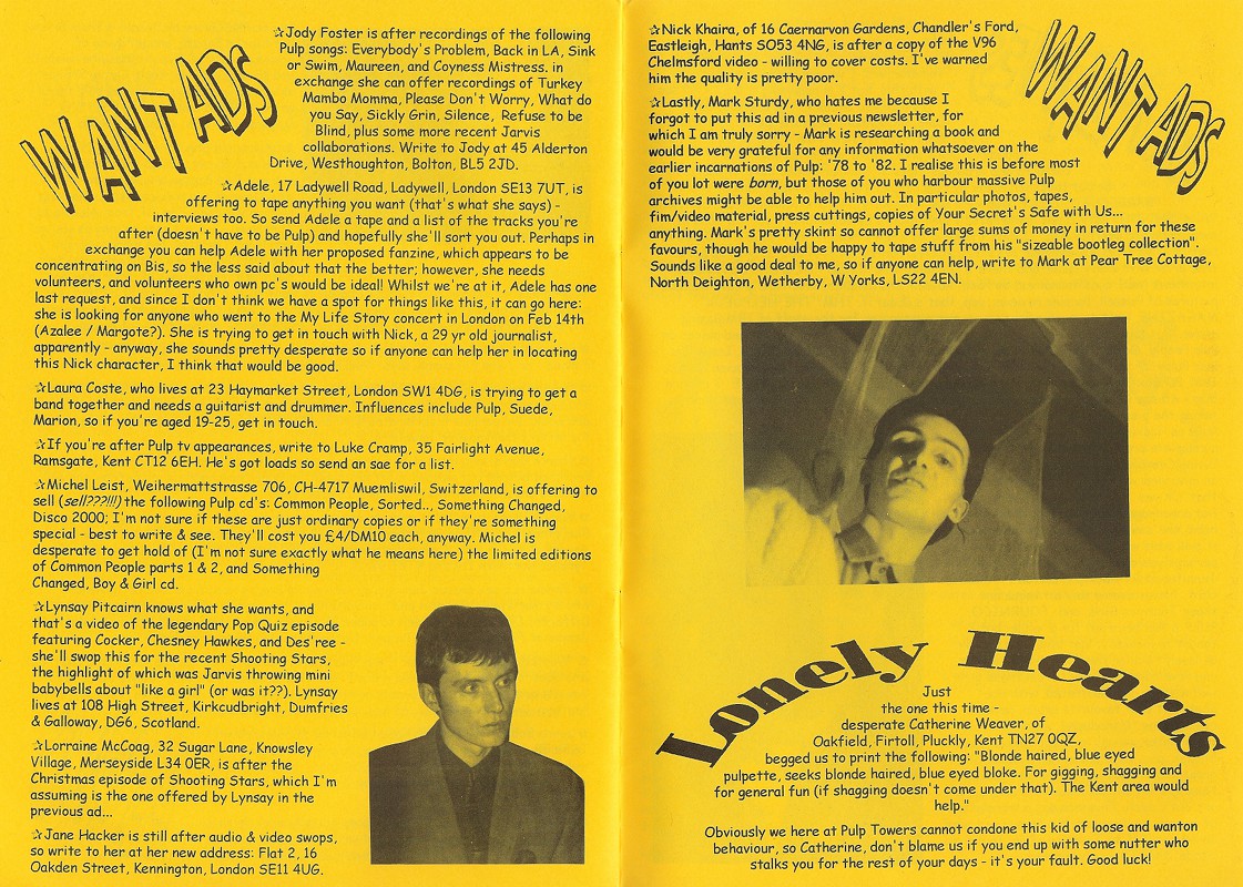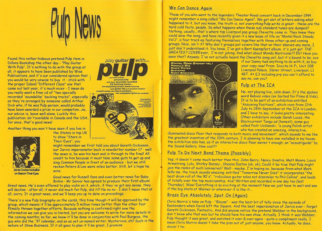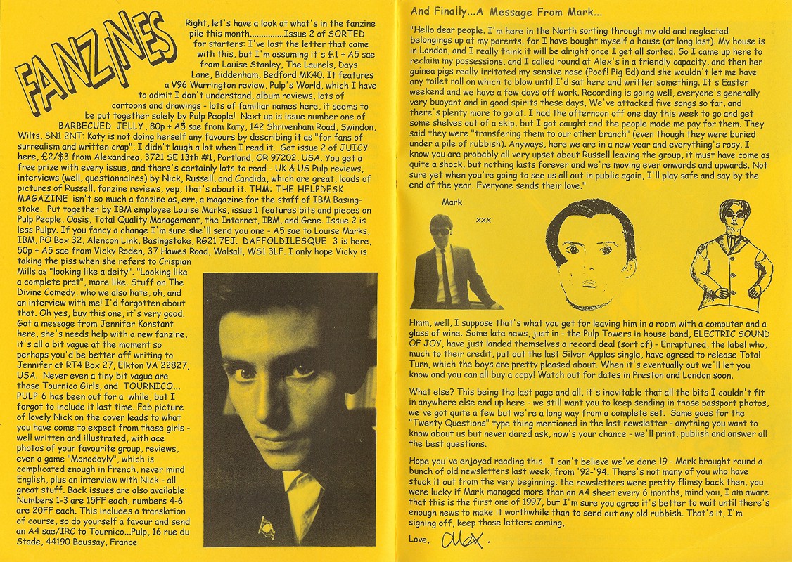 Right, let's have a look at what's in the fanzine pile this month............... Issue 2 of SORTED for starters: I've lost the letter that came with this, but I'm assuming it's £1 + A5 sae from Louise [...], Bedford MK40. It features a V96 Warrington review. Pulp's World, which I have to admit I don't understand, album reviews, lots of cartoons and drawings - lots of familiar names here, it seems to be put together solely by Pulp People! Next up is issue number one of BARBECUED JELLY, 80p + A5 sae from Katy, [...], Swindon, Wilts [...]: Katy is not doing herself any favours by describing it as "for fans of surrealism and written crap"; I didn't laugh a lot when I read it. Got issue 2 of JUICY here, £2/$3 from Alexandrea, [...] Portland, OR [...], USA. You get a free prize with every issue, and there's certainly lots to read - UK & US Pulp reviews, interviews (well, questionnaires) by Nick, Russell, and Candida, which are great, loads of pictures of Russell, fanzine reviews, yep, that's about it. THM: THE HELPDESK MAGAZINE isn't so much a fanzine as, err, a magazine for the staff of IBM Basingstoke. Put together by IBM employee Louise [...], issue 1 features bits and pieces on Pulp People, Oasis, Total Quality Management, the Internet, IBM, and Gene. Issue 2 is less Pulpy. If you fancy a change I'm sure she' II send you one - A5 sae to Louise [...], Basingstoke, [...]. DAFFOLDILESQUE 3 is here, 50p + A5 sae from Vicky [...], Walsall, [...]. I only hope Vicky is taking the piss when she refers to Crispian Mills as "looking like a deity". "Looking like a complete prat", more like. Stuff on The Divine Comedy, who we also hate, oh, and an interview with me! I'd forgotten about that. Oh yes, buy this one, it's very good. Got a message from Jennifer [...] here, she's needs help with a new fanzine, it's all a bit vague at the moment so perhaps you'd be better off writing to Jennifer at [...] Elkton VA [...], USA. Never even a tiny bit vague are those Tournico Girls, and TOURNICO... PULP 6 has been out for a while, but I forgot to include it last time. Fab picture of lovely Nick on the cover leads to what you have come to expect from these girls - well written and illustrated, with ace photos of your favourite group, reviews, even a game "Monodoyly", which is complicated enough in French, never mind English, plus an interview with Nick - all great stuff. Back issues are also available: Numbers 1-3 are 15FF each, numbers 4-6 are 20FF each. This includes a translation of course, so do yourself a favour and send an A4 sae/IRC to Tournico...Pulp, [...] Boussay, France