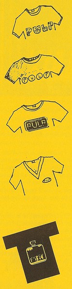 You know it makes sense buying direct from us - free postage if you live in the UK, speedy service, and if you're not 100% happy with your order, we'll exchange it. Unfortunately due to the cost of overseas postage we have to charge p+p on bags & T shirts if you live outside the UK: $5, 22FF, or £3, depending on which currency you're paying with - that's per order, not per item. Once again I've been having a bit of a clear out here at Pulp Towers and here for your delectation are the remaining Pulpy items of clothing & accessories currently lying around the office.... remember to list a first and second choice in case we've run out.