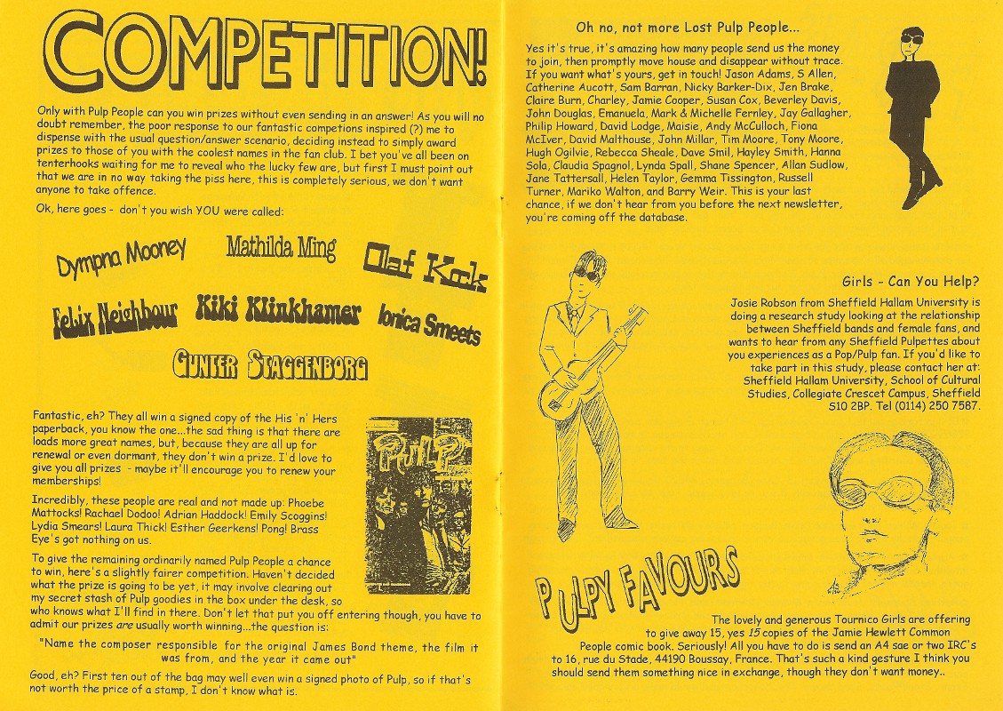 Only with Pulp People can you win prizes without even sending in an answer! As you will no doubt remember, the poor response to our fantastic competions inspired (?) me to dispense with the usual question/answer scenario, deciding instead to simply award prizes to those of you with the coolest names in the fan club. I bet you've all been on tenterhooks waiting for me to reveal who the lucky few are, but first I must point out that we are in no way taking the piss here, this is completely serious, we don't want anyone to take offence.