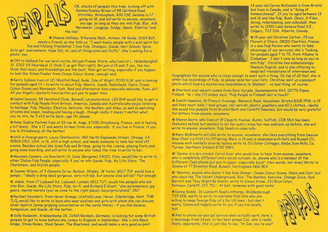 OK, stacks of penpals this time, kicking off with Gemma [...], Birmingham, [...]; Gemma is 17 going on 18, and will write to anyone, anywhere, any age, so long as they are into Pulp, Blur, Ash, Menswear, Longpigs, Dodgy, Space, Elastica "and the like".