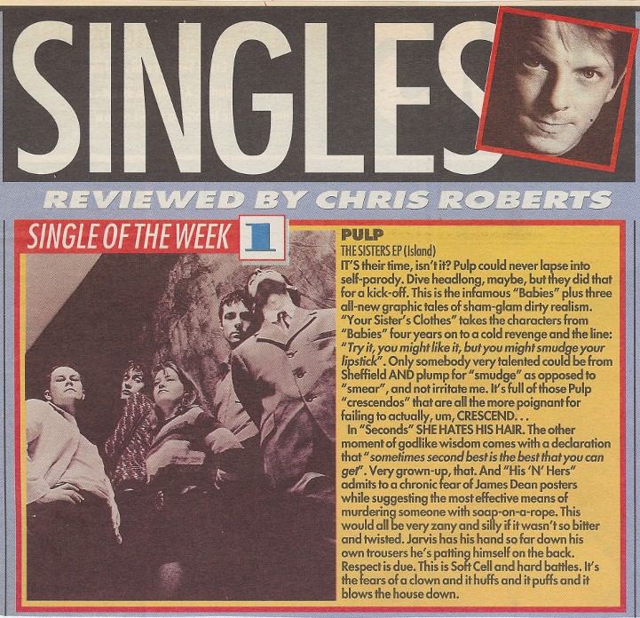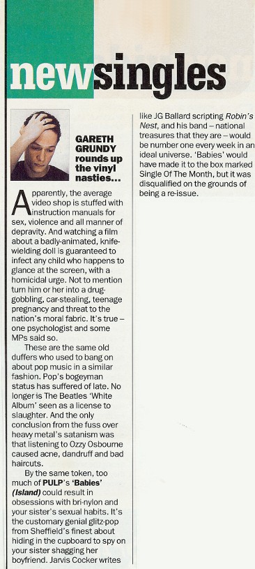 [...] By the same token, too much of PULP's 'Babies' (Island) could result in obsessions with bri-nylon and your sister's sexual habits. It's the customary genial glitz-pop from Sheffield's finest about hiding in the cupboard to spy on your sister shagging her boyfriend. Jarvis Cocker writes like JG Ballard scripting Robin's Nest, and his band - national treasures that they are - would be number one every week in an ideal universe. 'Babies' would have made it to the box marked Single Of The Month, but it was disqualified on the grounds of being a re-issue.