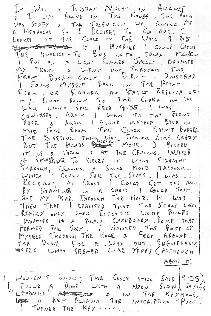 I was relieved at least I could get out now. By standing on a chair I could just get my head through the hole. It was then I realised that the stars were really only small electric light bulbs mounted in a black cardboard dome that formed the sky. I hoisted the rest of myself through the hole for a way out.Eventually, after what seemed like ages (although I wouldn't know: the clock still said 9:35) I found a door with a neon sign above it, saying "The Leadmill" and in the keyhole a key bearing the inscription "Pulp". I closed my eyes and turned the key.